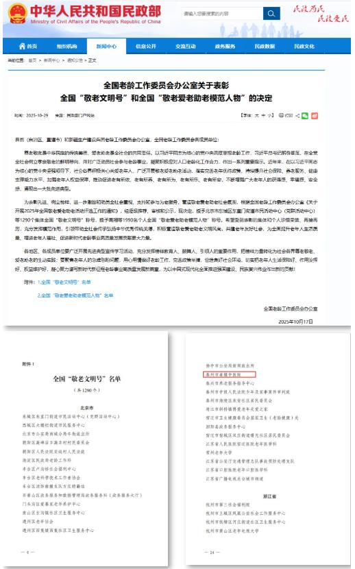日前,全国老龄工作委员会办公室发布表彰决定授予1290个集体全国“敬老文明号”称号和1990名个人全国“敬老爱老助老模范人物”称号。我院获评全国“敬老文明号”荣誉。