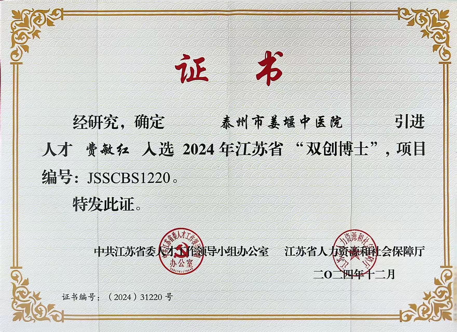 泰州市姜堰中医院费敏红博士入选2024年江苏省“双创博士”项目,标志着医院人才战略计划跨出坚实的一步。