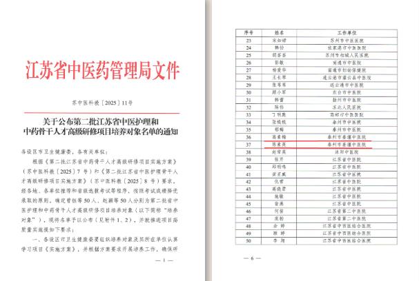 近日,江苏省中医药管理局正式公布了第二批中药骨干人才高级研修项目培养对象名单,我院药学团队再传捷报——高素梅、陈素英凭借过硬的专业能力和扎实的药学功底,经严格遴选,成功入选!
