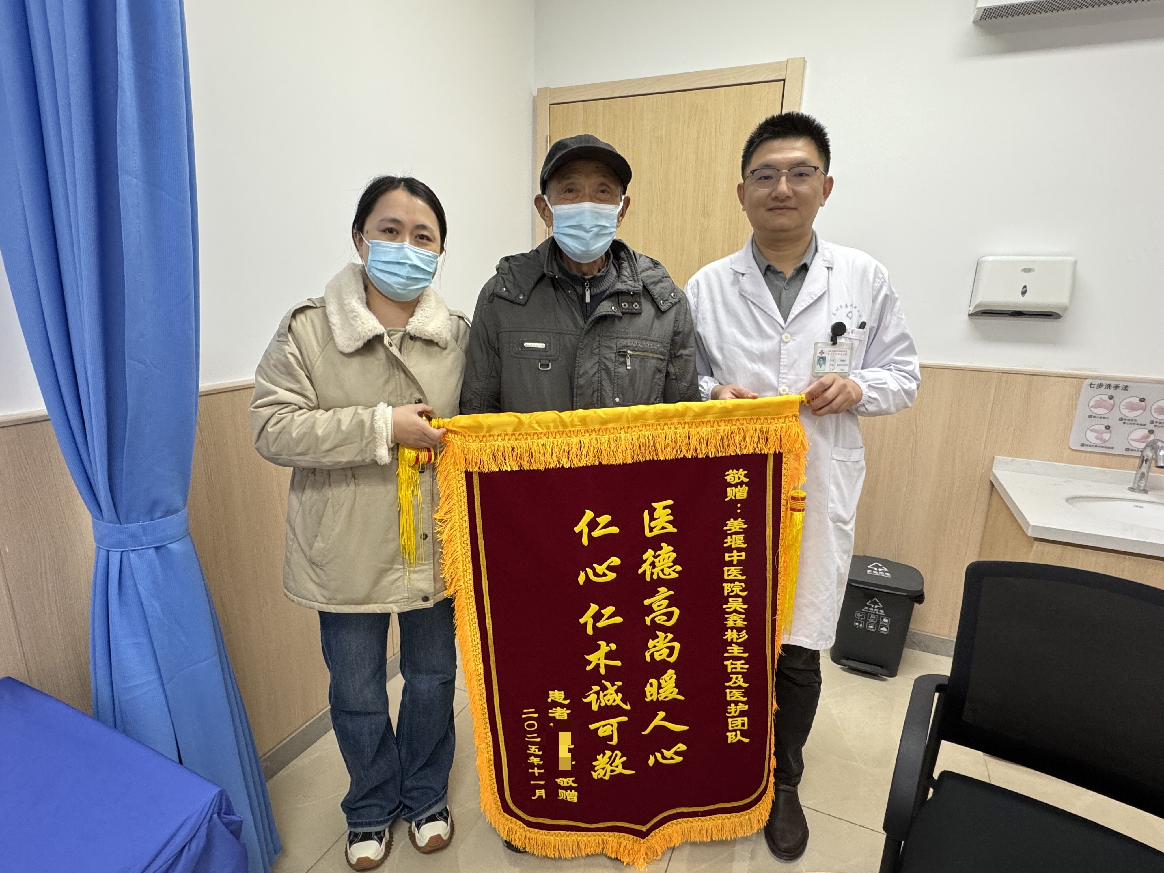 近日,在本院中医外科门诊出现了感人一幕:治愈出院的曹爷爷在女儿的陪同下,专程将一面鲜红的锦旗送到了吴医生手中,感谢吴医生用传统中医方法治好了困扰他长达近2年的术后难愈伤口,让他重获健康与安宁。
